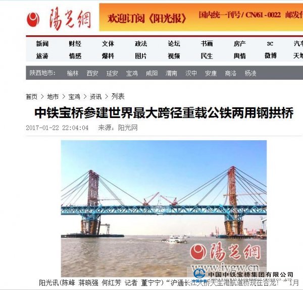 在沪通长江大桥建设中,中铁宝桥承担了天生港专用航道50000余吨钢梁制造任务。据专家介绍,天生港航道桥具有体量大、材料新、精度高、合龙准等技术特点。该桥钢桁梁每米长度钢结构重量超过50吨,相当于每走一步就要跨过50多吨重的钢结构;该桥受力最关键的墩顶区域和拱肋部位采用量身定做的Q500qE高强度钢,满足了大跨度钢结构受力要求,为我国国内首次采用的最高强度桥梁用钢;全桥钢梁共有40万套螺栓,其中最复杂的一个节点须与17个方向的杆件连接,含高强螺栓数量3072个,每个螺栓孔位置不能有丝毫错位,由20多人组成的专业施拧团队专门负责施拧和检查,所有螺栓及螺栓孔都达到匹配,各项指标满足规范要求;钢结构栓接合龙对准难度极大,通过大量的科研攻关,最终确保合龙精度控制在毫米级。